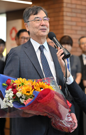 ノーベル生理学・医学賞の受賞決定から一夜明け、取材に応じる大阪大の坂口志文栄誉教授。受賞決定の実感を問われると「これだけ取材していただくと、何となく実感はある」と笑みを浮かべた=7日、大阪府吹田市 【時事通信社】