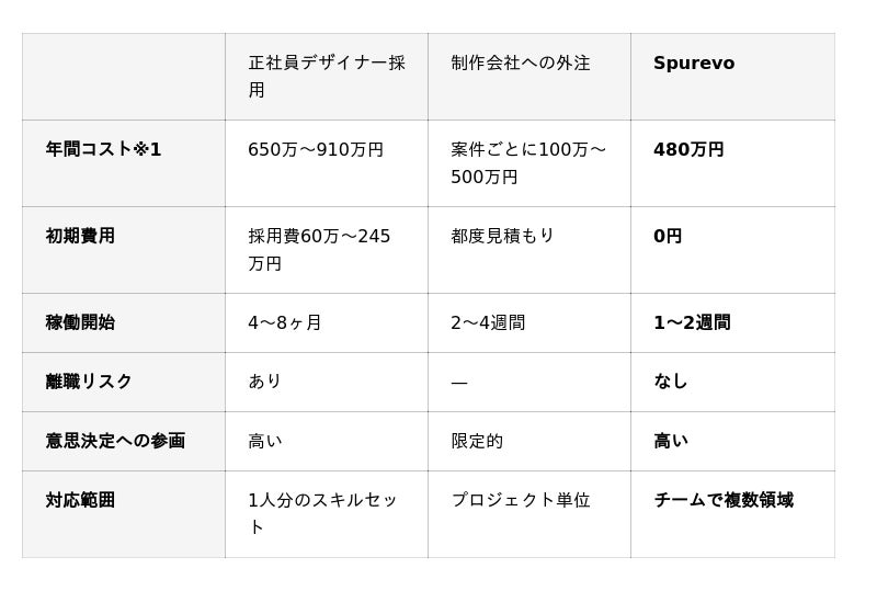 ※1 正社員デザイナーの年間コストは給与+社会保険料。採用費(60万~245万円)は初期費用に計上。背景セクションの「初年度コスト900万~1,200万円」は採用費を含んだ初年度の総額