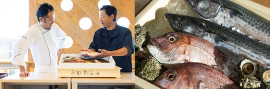 料理長 佐藤は、魚介の旬や鮮度を見極め、季節によっては野菜や他の食材に置き換えながら、一皿一皿に山形庄内の四季の恵みを表現していますが、さらにシェフ自ら食材の魅力をお客様に紹介することで、庄内の自然や生産者とのつながりを体感いただくことができる構成になっています。