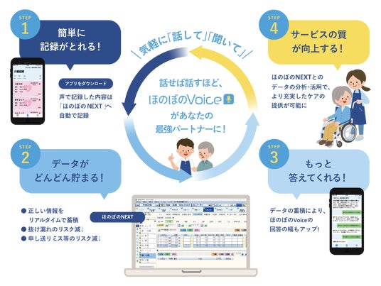 「ほのぼのVoice」をメイン展示いたします。本アプリは、両手がふさがった状態でもスムーズな音声入力・確認を可能にし、リアルタイムかつ正確な情報共有を実現することで、介護の質の向上に貢献します。最先端の介護ソリューションを直接ご覧いただけるこの機会に、ぜひ多くのお客様にご来場いただきたく存じます。