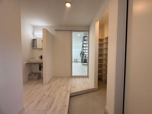ユニテハウス神町西展示場 玄関からシューズクローク、洗面を臨む