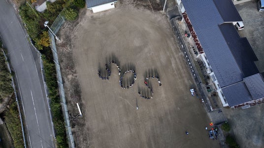 人文字「SOS」をドローンで上空から確認 三谷分校グラウンドで住民約70名が形成した人文字「SOS」
