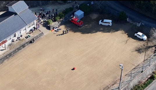中条小学校グラウンドでの訓練の様子。手前に見えるのがドローンポート(Dock3)調査用ドローン。地域住民約150名が見守る中、デモンストレーションを実施。