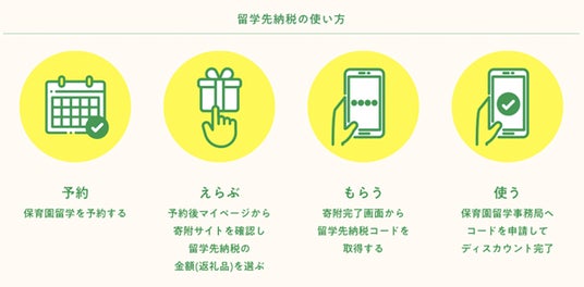 「留学先納税(R)」は、ふるさと納税制度を活用し、本市に寄附をすると、返礼品としてオンラインコード「留学先納税コード」を受け取り、「保育園留学」の費用の一部に充当できる仕組みです。米沢市の「保育園留学」に興味のある方は、ぜひ「留学先納税(R)」もご検討ください。