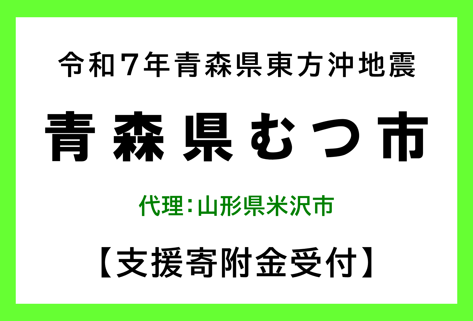 このたびの代理寄附の受付は、米沢市と青森県むつ市との「会津若松市交流市町災害時相互支援に関する協定」に基づき、青森県むつ市からの要請を受けて行うもので、お預かりした寄附金は青森県むつ市にお渡しします。皆さまからの温かいご支援を心よりお待ちしております。