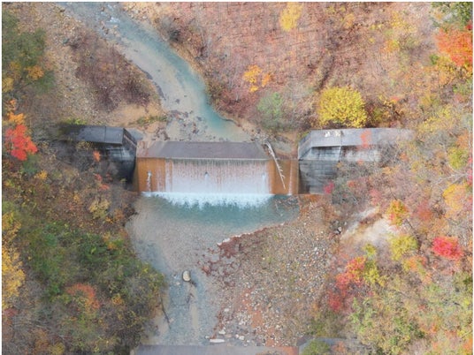 高度100mから3倍ズームカメラで撮影した堰堤の画像