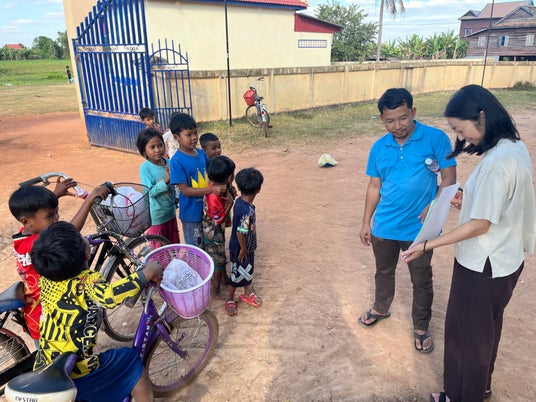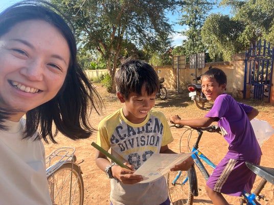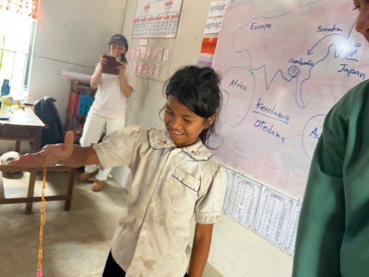 カンボジア・アンロンベンで「ミャクミャク」を受け取る子ども