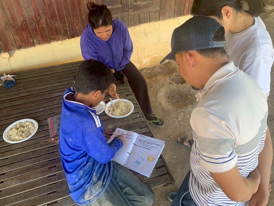 クメール語で書かれた教科書で「世界」を学ぶ