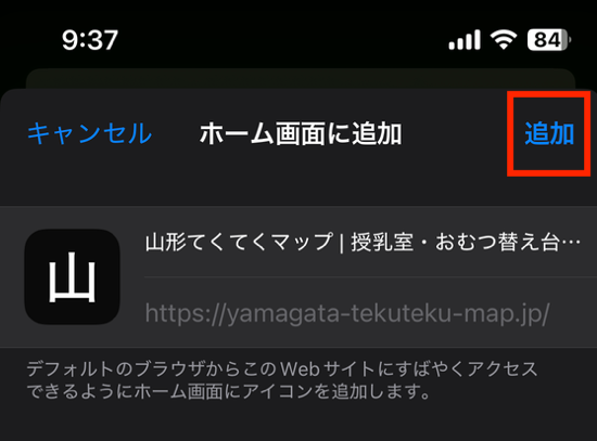 その後「ホーム画面に追加」をタップしたら、「追加」を選択して完了です。