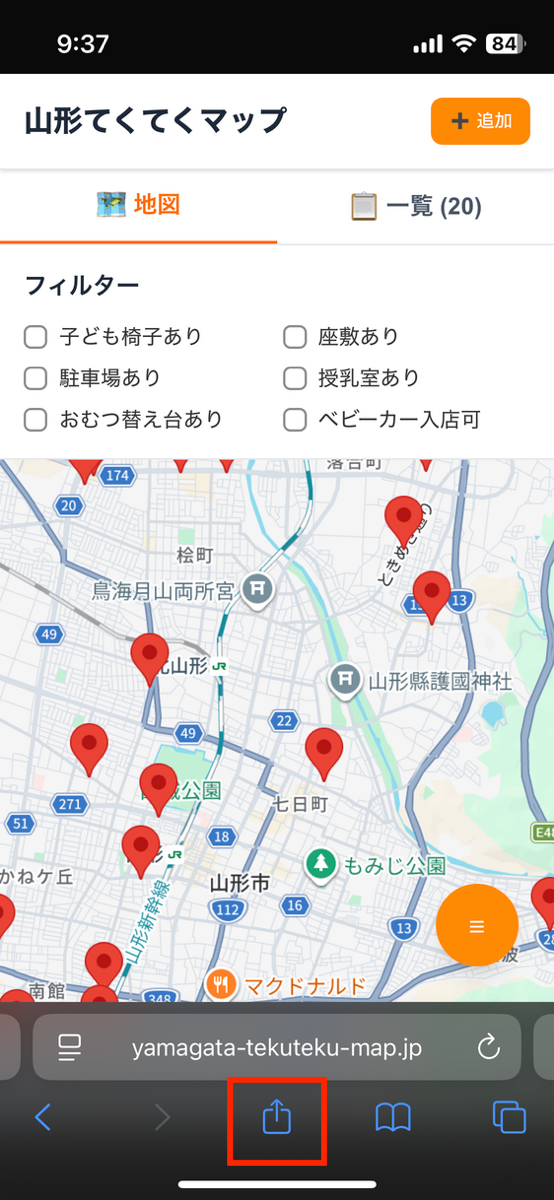 Safariで山形てくてくマップを開き、共有ボタンをタップします。