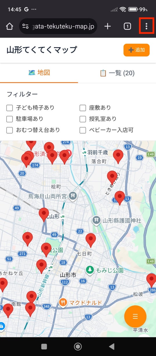 Chromeで山形てくてくマップを開き、三点リーダーをタップします。