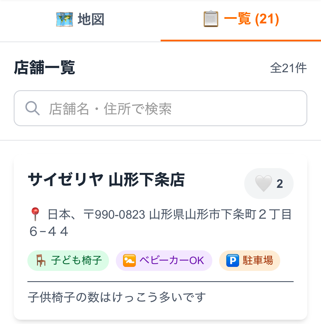 しかし、お出かけ先の情報は店舗ごとにGoogleマップやInstagramなどで個別に調べる必要があり、一括で検索できる手段がほとんどありません。全国規模の子育て支援アプリは存在するものの、山形市に特化し、座敷や子ども椅子の年齢別台数まで網羅したサービスはこれまでありませんでした。