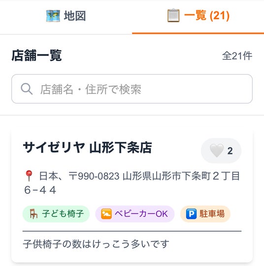 - 画面上部のフィルターで「子ども椅子あり」「座敷あり」などの条件で絞り込み