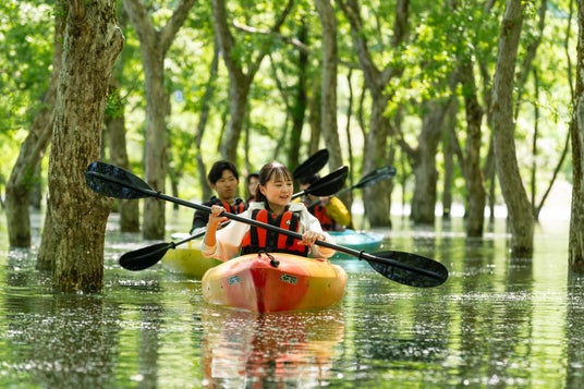 水没林は湖岸公園からもよく見えますが、水面に映る青い空や新緑の木々に抱かれるカヌーツアーは特別な体験です。フルレンタル可能で、老若男女、初心者でもお楽しみいただけます。