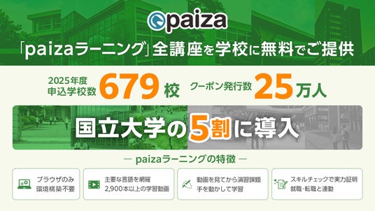 ITエンジニア向け転職・就職・学習プラットフォーム「paiza(パイザ)」を運営するpaiza株式会社(東京都港区、代表取締役社長/CEO 舘康人)は、当社が提供する「paizaラーニング 学校フリーパス」の2025年度申込学校数が679校、クーポン発行数が25万人を突破したことを発表いたします。特に国立大学の5割に導入されるなど、文理問わず高等教育における「AI・データサイエンス教育プラットフォーム」のスタンダードとして利用範囲が拡大し続けています。